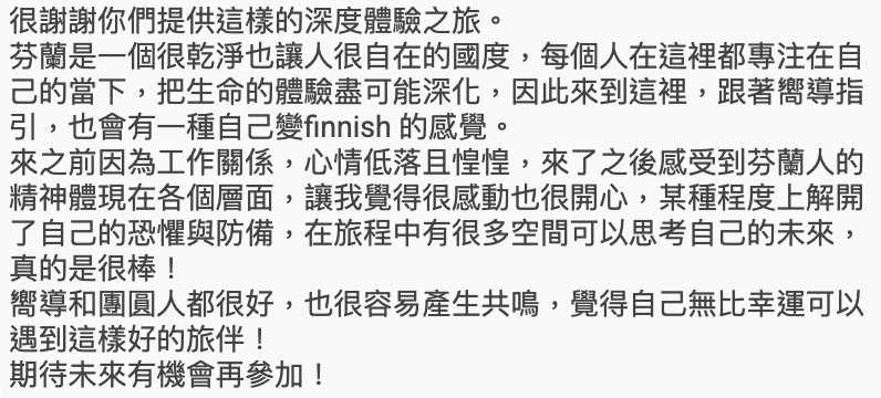 從這些回饋中可以看見,許多旅人在出發前帶著些猶豫與期待,但實際走進赫爾辛基、開始長住生活後,感受到的是自在、安全,以及與當地更貼近的連結感。