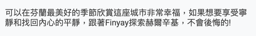 從這些回饋裡可以看出來,大家十分享受能夠慢慢認識赫爾辛基,這座小巧但被大自然包圍的城市!